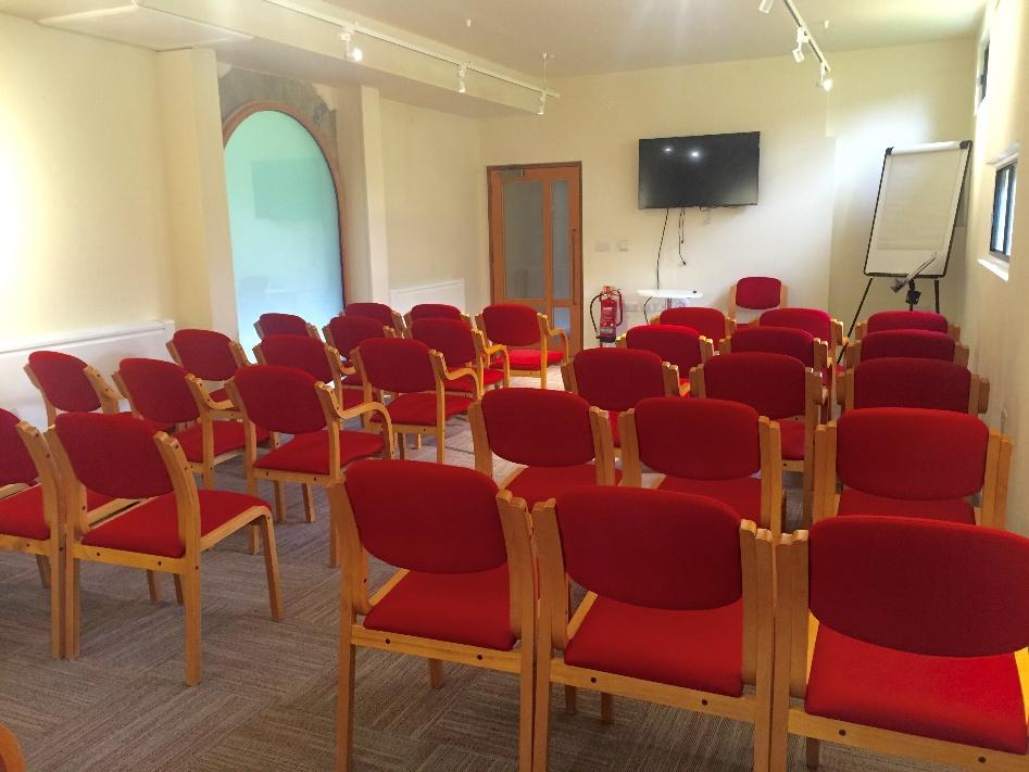 This is a large, well-lit room on the ground floor of the Guest House. It is separated from the Refectory by a folding room divider. The room seats up to 50 theatre style with rows of chairs but can be configured with tables for smaller groups. The base cost for hiring this room is £120 for one session or £180 for two sessions and that includes the first 10 guests. If booking for larger numbers the price increases – Please see our price list from January 2025.
